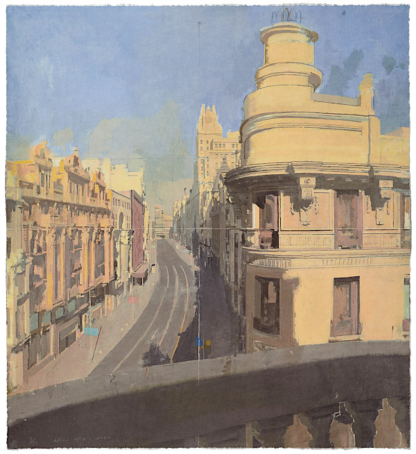 Tomelloso, 1936. Pintor, escultor y grabador, es uno de los máximos representantes del realismo contemporáneo español. Formado en la Real Academia de Bellas Artes de San Fernando en Madrid y relacionado con la escuela madrileña de pintura. Pintor pausado y reflexivo, su temática abarca paisajes urbanos de Madrid, interiores domésticos y retratos, captados tras una intensa observación del tiempo y de la luz y con una precisión de dibujo casi fotográfica que no prescinde de la soltura del trazo. Entre sus trabajos más conocidos destacan sus vistas de la Gran Vía, en las que capta el paso de las horas del día y de las estaciones, tema que ha llevado al lienzo en numerosas ocasiones y que también ha representado en forma de grabado. Su obra gráfica está presente en la galería de arte Sigüenza desde junio de 2021